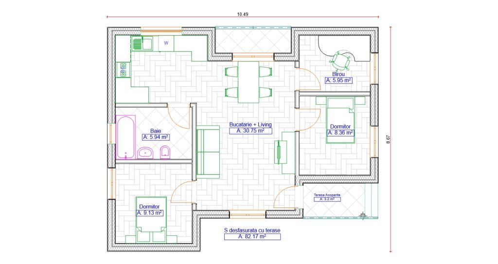 Casa Pop este o locuință modernă și eficientă, ideală pentru familiile care își doresc confort și funcționalitate într-un spațiu optim compartimentat. Cu o suprafață desfășurată de 82,19 mp (inclusiv terasa) și o suprafață a acoperișului de 116,78 mp, casa oferă un echilibru perfect între spațiu interior și protecție durabilă.